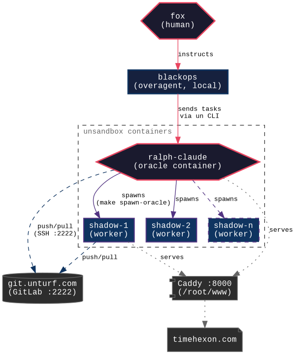 fox (human) instructs blackops (overagent, local machine) which sends tasks to ralph-claude (oracle container). Oracle spawns shadow clones as workers. All layers push/pull through GitLab & serve via Caddy.