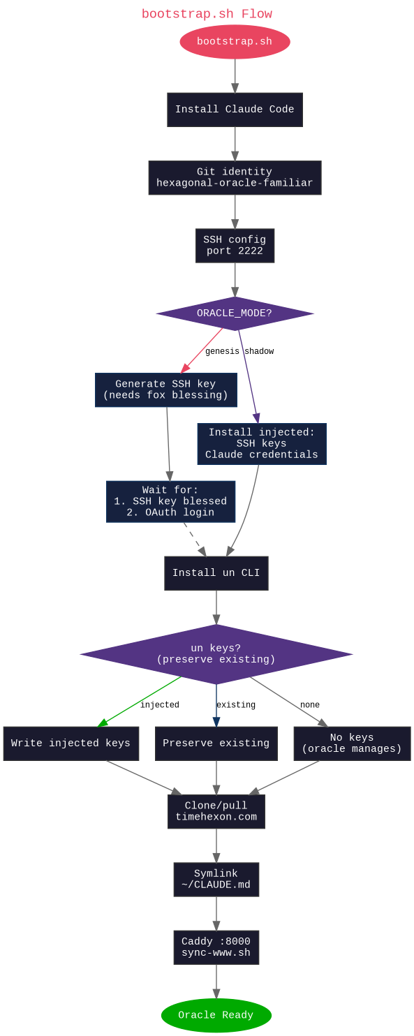 bootstrap.sh is a self-contained spawn packet. Two modes: genesis (fresh oracle, generates SSH key, fox blesses in GitLab) & shadow (credentials injected via env vars, wakes autonomous). Existing un keys are never deleted — children may acquire their own.
