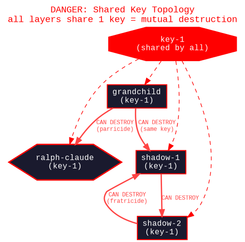 What happens when all layers share one key: mutual destruction. Grandchild can destroy parent. Sibling can destroy sibling. Fratricide & parricide become possible. This is a false perfect circle — it collapses on itself. See: Journal Entry 13: Tempest